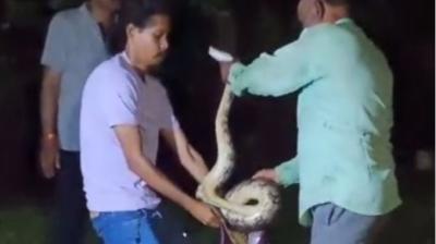 रेस्ट हाउस में फैली दहशत: शिकार की खोज में घुसे अजगर को रेस्क्यू टीम ने निकाला, दो लोगों को साथ मिलकर उठाना पड़ा