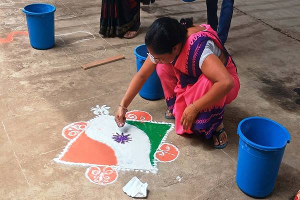 भोपाल : हर घर तिरंगा अभियान में प्रदेश के सभी जिलों में राष्ट्रध्वज के प्रति सम्मान और समर्पण के लिये जागरूकता कार्यक्रम आयोजित किए जा रहे हैं। बुरहानपुर जिले की शाहपुर नगर परिषद कार्यालय के प्रांगण में महिला बाल विकास विभाग की आंगनवाड़ी कार्यकर्ताओं द्वारा आकर्षक रंगोली बनाकर राष्ट्रध्वज के प्रति जागरूकता का संदेश दिया गया।