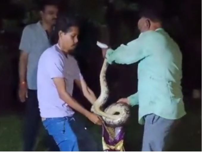 रेस्ट हाउस में फैली दहशत: शिकार की खोज में घुसे अजगर को रेस्क्यू टीम ने निकाला, दो लोगों को साथ मिलकर उठाना पड़ा