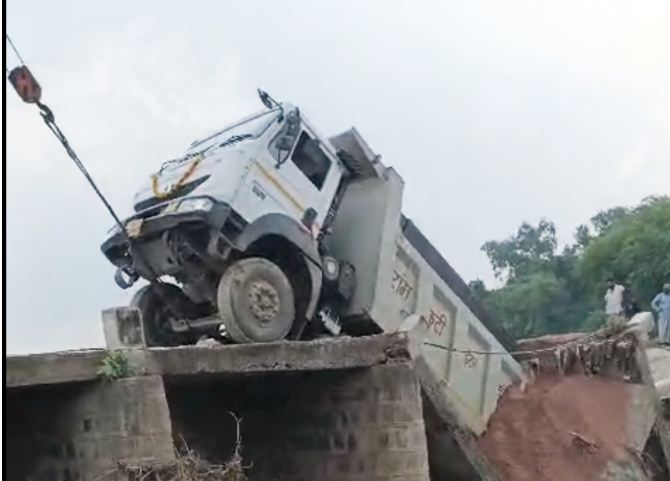 रेत भरे ट्रक का भार नहीं झेल पाया पुल, छतरपुर में ढहा पुल — बाल-बाल बचे लोग