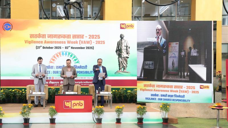 नई दिल्ली, 27 अक्टूबर 2025: पंजाब नैशनल बैंक ने द्वारका, नई दिल्ली स्थित कॉर्पोरेट कार्यालय में सतर्कता जागरूकता सप्ताह-2025 का शुभारंभ किया, जहाँ प्रबंध निदेशक एवं मुख्य कार्यपालक अधिकारी श्री अशोक चंद्र तथा मुख्य सतर्कता अधिकारी श्री राघवेंद्र कुमार ने स्टाफ सदस्यों को सत्यनिष्ठा की शपथ दिलाई तथा पारदर्शिता, जवाबदेही एवं नैतिक शासन के प्रति बैंक की अटूट प्रतिबद्धता की भी पुष्टि की। कार्यकारी निदेशकगण - श्री बी.पी. महापात्र तथा श्री डी सुरेंद्रन ने भी उपस्थित स्टाफ़ सभा को संबोधित किया। माननीय केंद्रीय सतर्कता आयोग के निर्देशानुसार, पीएनबी 27 अक्टूबर से 2 नवंबर, 2025 तक सतर्कता जागरूकता सप्ताह मना रहा है।