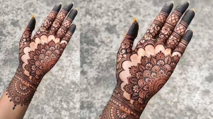 अगर आप मेहंदी से पूरी हथेली को भरना चाहते हैं तो तस्वीर में नजर आ रही मेहंदी डिजाइन अच्छी लगेगी। इसमें जाली, मंडाला, मोर, बेल जैसे पैटर्न बना सकते हैं। यह डिजाइन घनी, जटिल और कलात्मक होती है जो कि हाथों को भरा हुआ लुक देती है। दुल्हनों के लिए ये मेहंदी डिजाइन परफेक्ट है।