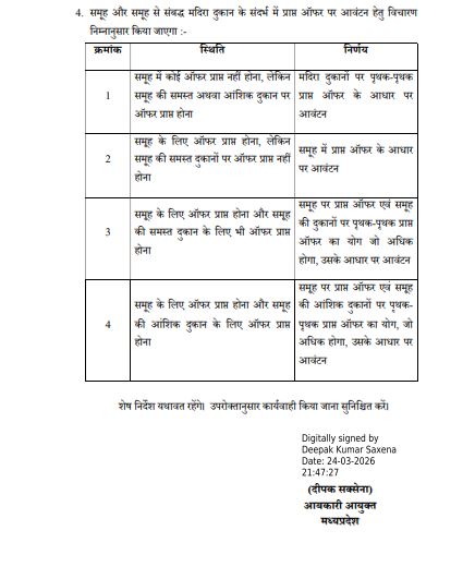 भोपाल/ग्वालियर। मध्यप्रदेश में वित्तीय वर्ष 2026-27 के लिए कम्पोजिट मदिरा दुकानों के निष्पादन हेतु ई-टेंडर प्रक्रिया का आठवां चरण शुरू कर दिया गया है। आबकारी आयुक्त दीपक सक्सेना द्वारा जारी संशोधित कार्यक्रम के अनुसार, इस चरण में शेष बची दुकानों और समूहों का आवंटन किया जाएगा। संशोधित कार्यक्रम के मुताबिक, ऑनलाइन टेंडर डाउनलोड और ऑफर सबमिट करने की प्रक्रिया 25 मार्च शाम 4 बजे से शुरू होकर 27 मार्च दोपहर 12 बजे तक चलेगी। इसी दिन दोपहर बाद ई-टेंडर कम ऑक्शन की प्रक्रिया शुरू होगी, जिसमें शाम 4:30 बजे से 5:30 बजे तक बोली लगेगी। यदि अंतिम समय में बोली आती है, तो हर 15 मिनट में समय बढ़ाया जाएगा।