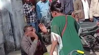 हाथ जोड़ता रहा युवक, चप्पल से वार करती दिखी महिला